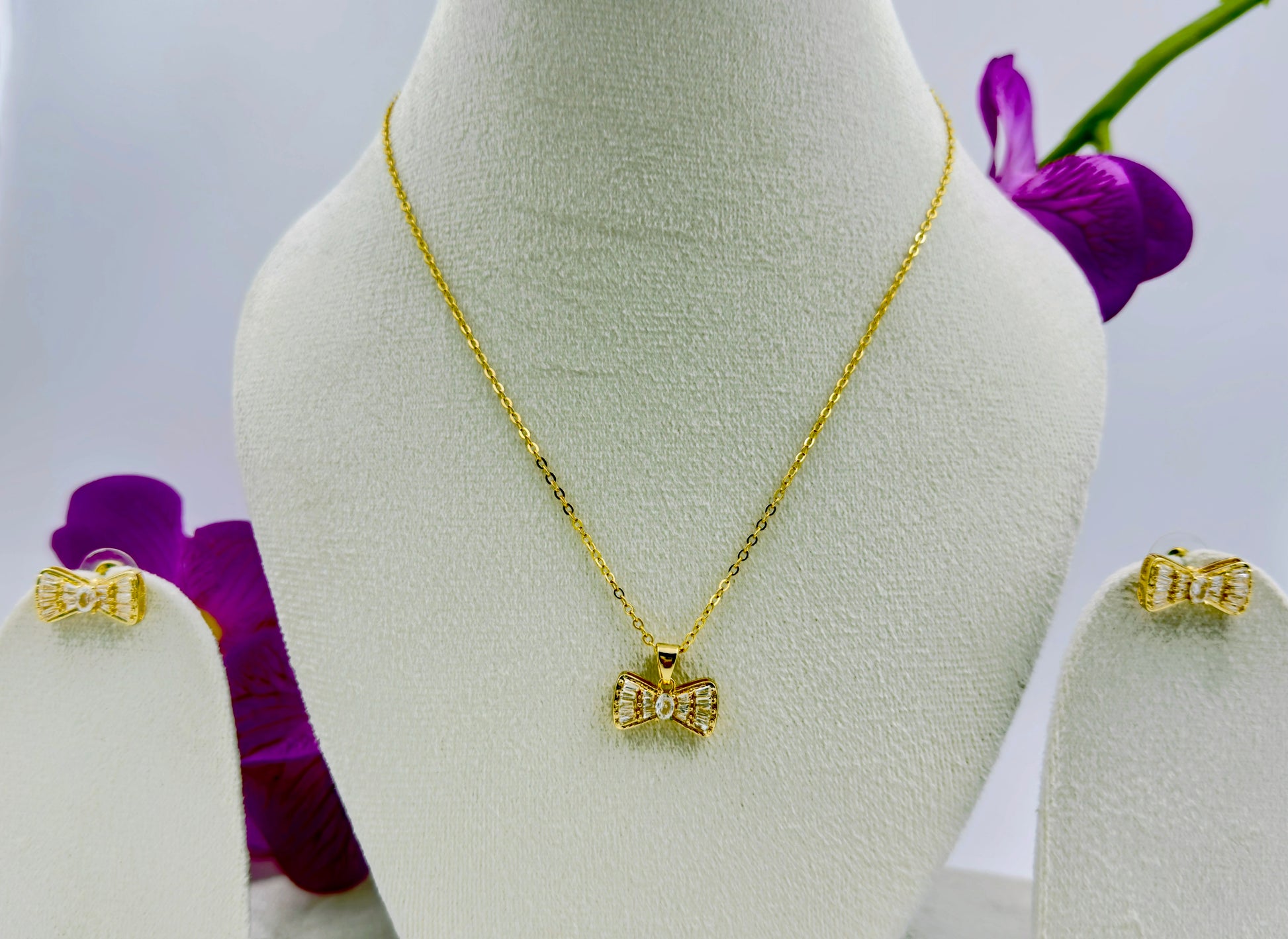 Introducing the exquisite Vionelie Bows that Glow Necklace Set, a beautifully crafted piece designed for subtle luxury and modern wear. This set is crafted with anti tarnish necklace set quality, ensuring lasting brilliance as you confidently adorn the spotlight with its sophisticated, focused sparkle.