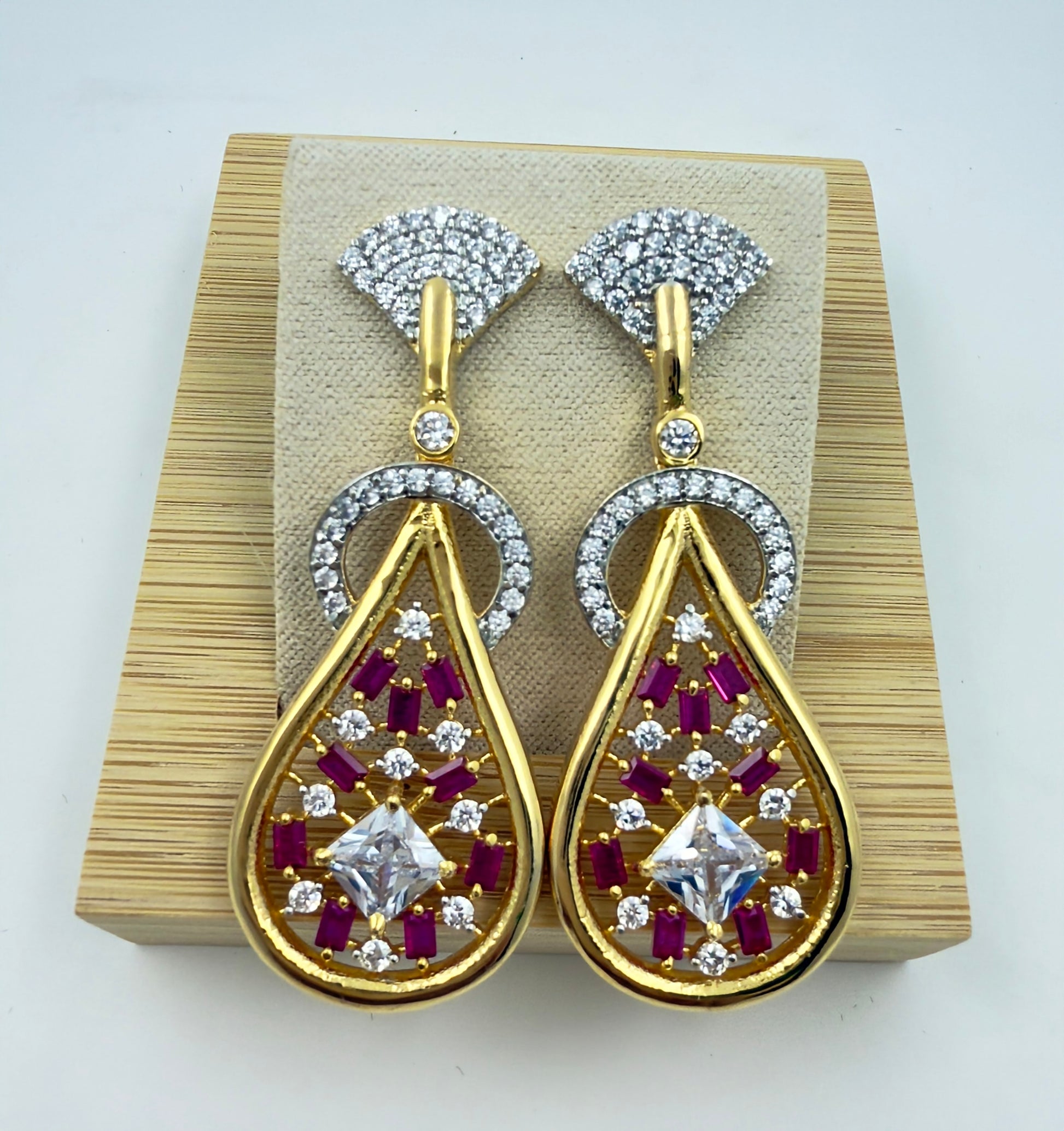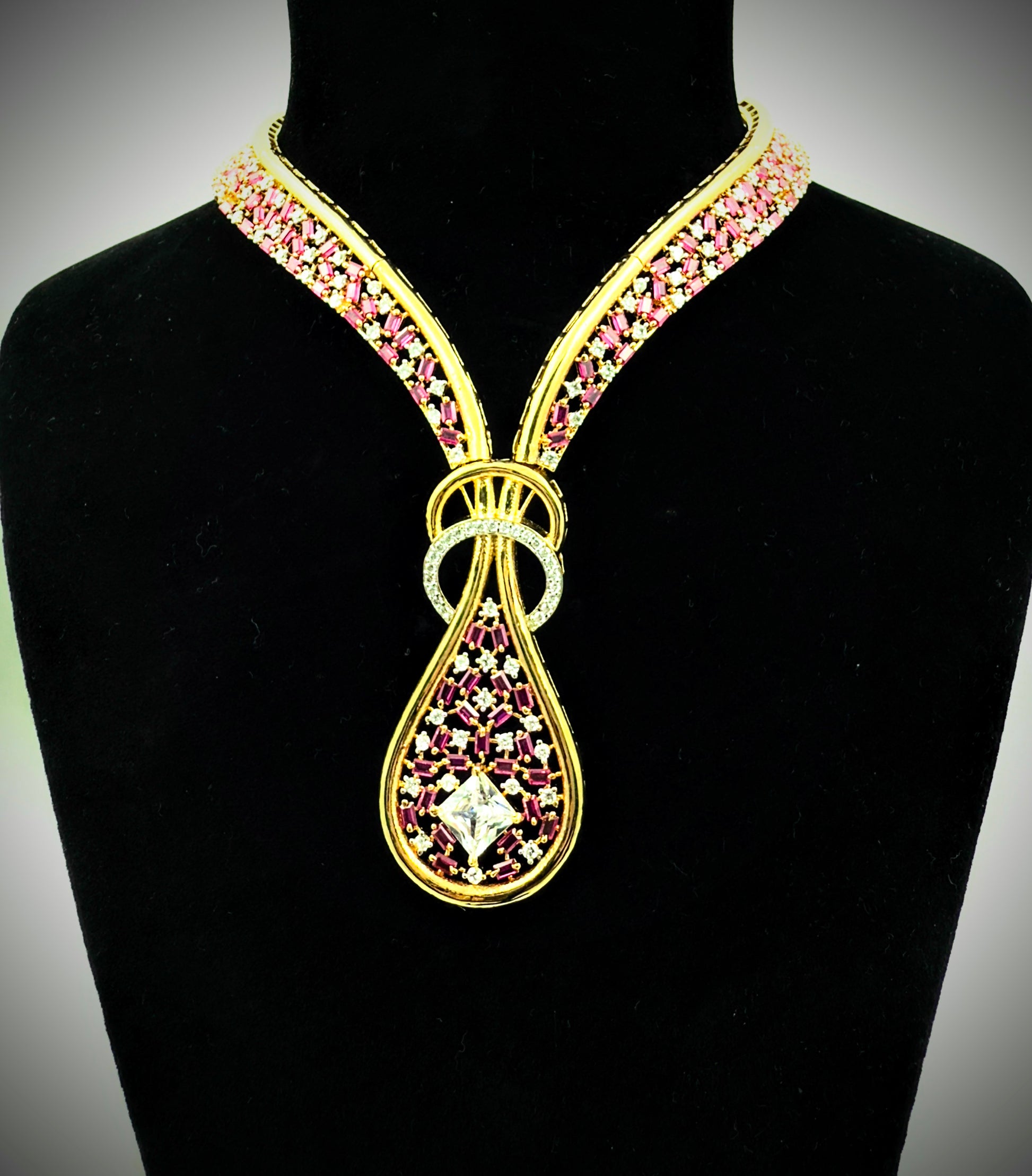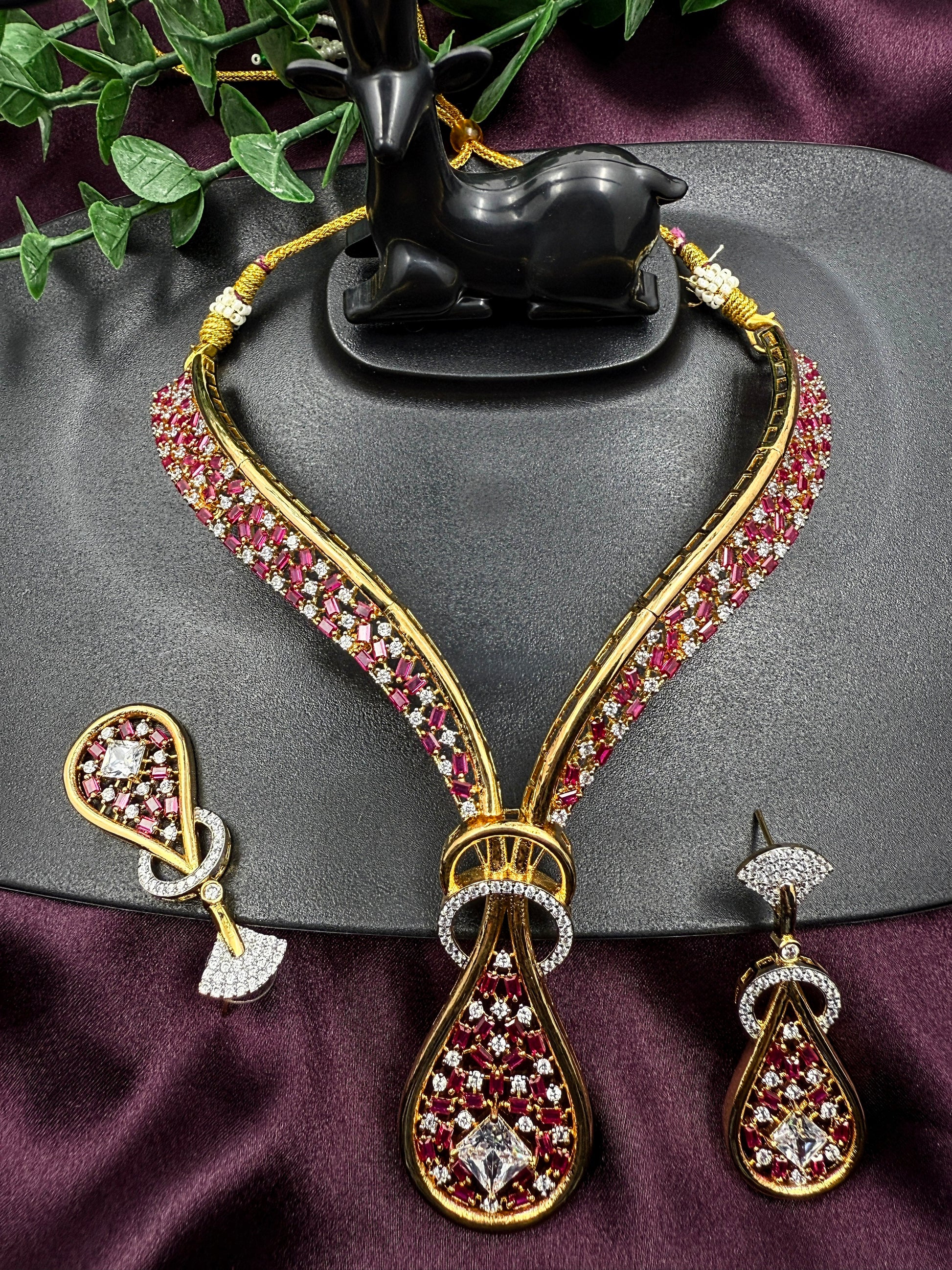 The necklace features a unique V-shaped collar of dazzling white diamond (CZ) stones, leading to a large, opulent teardrop pendant. Both the collar and the pendant are richly studded with vibrant ruby baguette (pink/red) stones, with a central sparkling square CZ at the pendant's core. The set is perfectly complemented by elegant matching Dangler earrings that echo the teardrop motif.