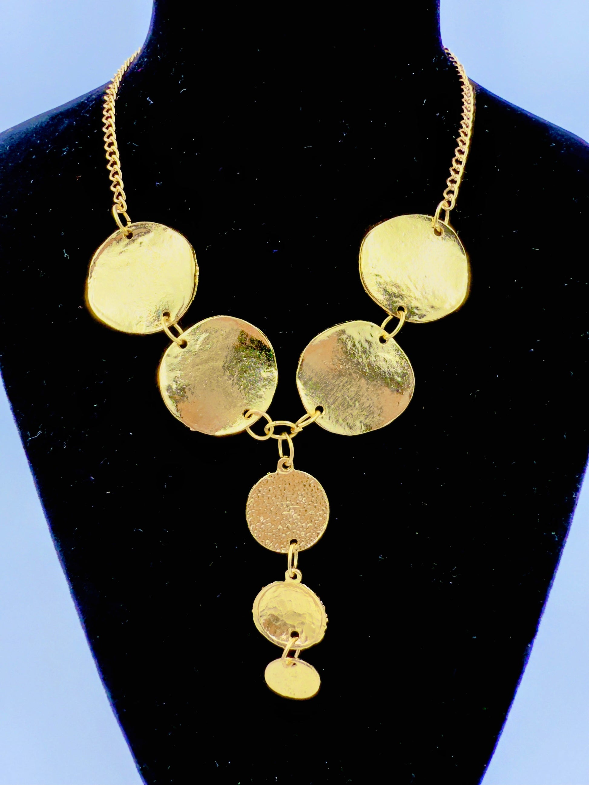 The heart of this collection is its striking series of big round hammered gold plates, which make a magnificent and artful statement. The handcrafted, hammered texture gives the set a unique, luxurious feel, while the generous size of the plates ensures a show-stopping effect. The Dominance Necklace Set is more than just jewelry; it’s a powerful accessory that beautifully symbolizes your unshakeable confidence and your impeccable taste.