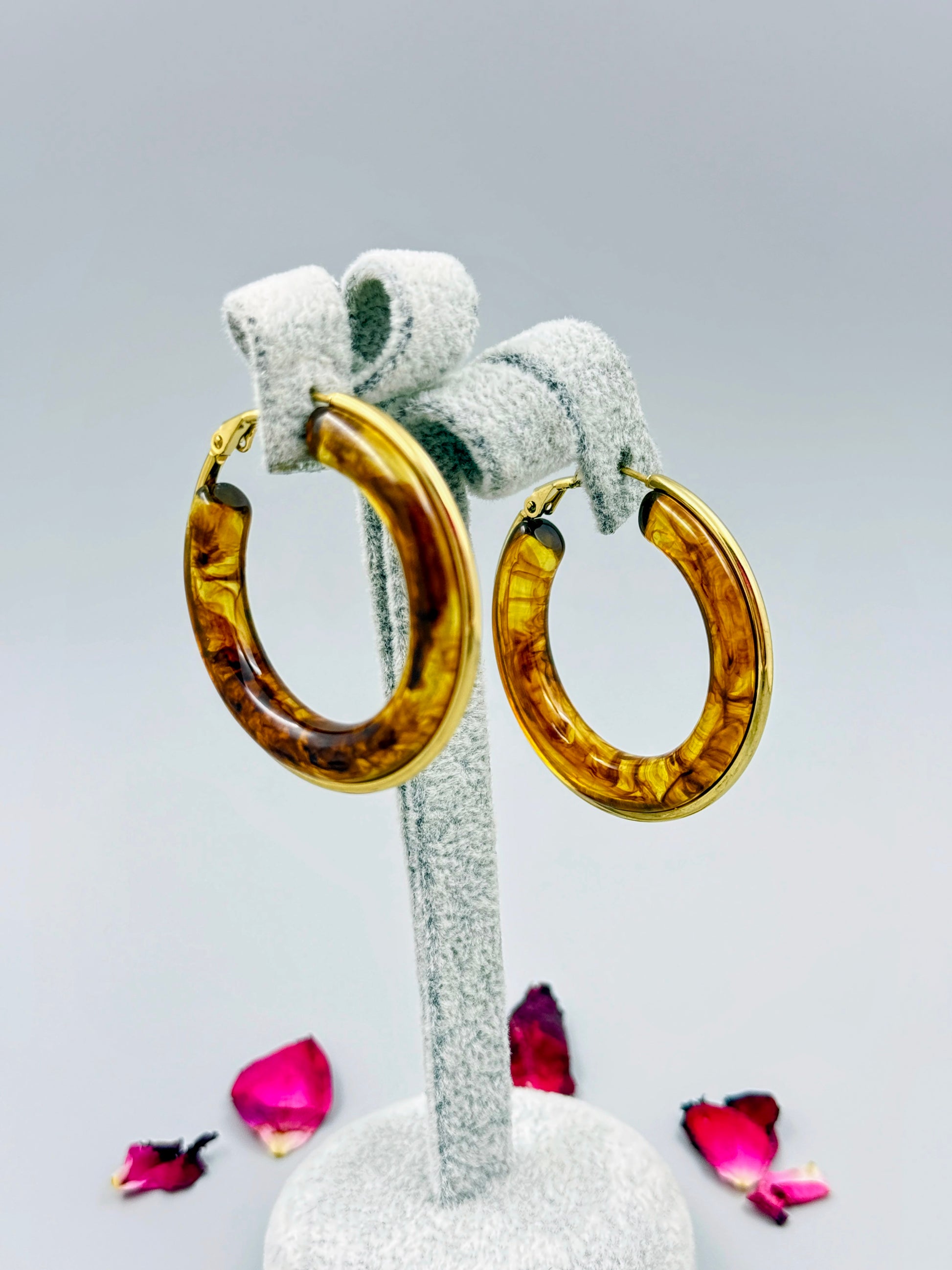 The heart of these hoops is an elegant and luxurious amber-toned crystal finish that radiates warmth and depth. This beautiful texture is perfectly complemented by the sleek, gold-toned frame that catches the light with every movement. The Elegant Crystal Hoops are the perfect choice for adding a touch of bold, sophisticated glamour to any outfit, from a professional daytime look to an elegant evening ensemble.