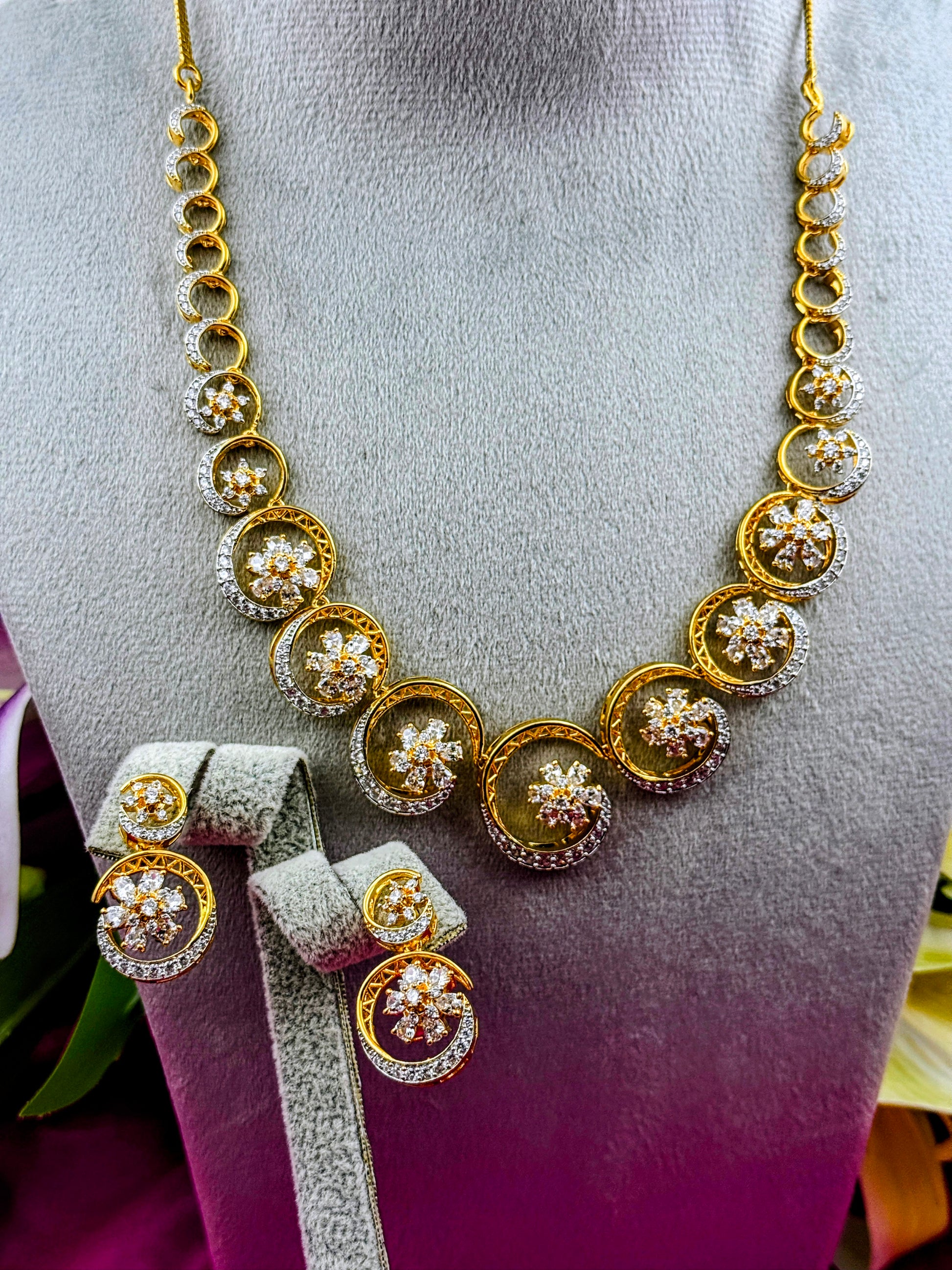 The heart of the set is the necklace, which features a line of diamond flowers linked together, forming a beautiful garland of sparkle. The intricate floral motifs, set within polished gold-toned circles, create a rich and detailed collar of brilliance. This exquisite piece comes with matching earrings that perfectly echo the necklace's enchanting design.