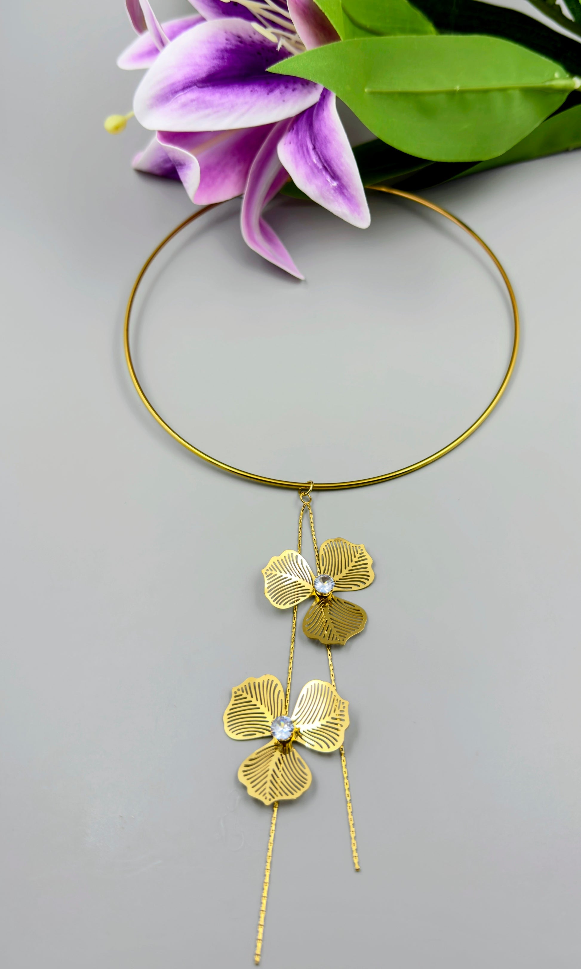 Introducing the exquisite Vionelie Floral Poise Hasli, a captivating neck piece that seamlessly blends timeless tradition with modern elegance. This luxurious anti-tarnish necklace is designed to be your signature style statement, allowing you to confidently adorn the spotlight with its one-of-a-kind design.