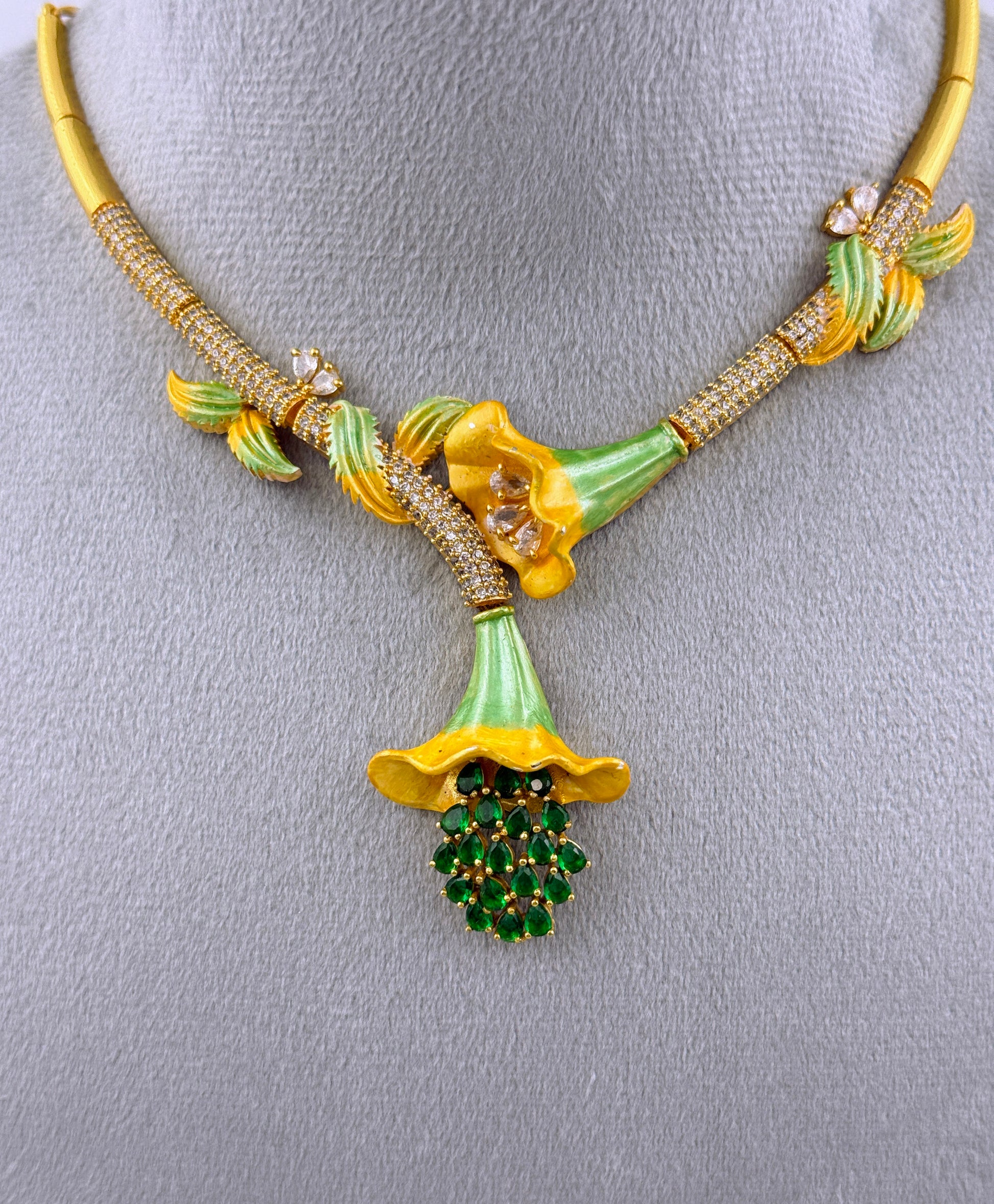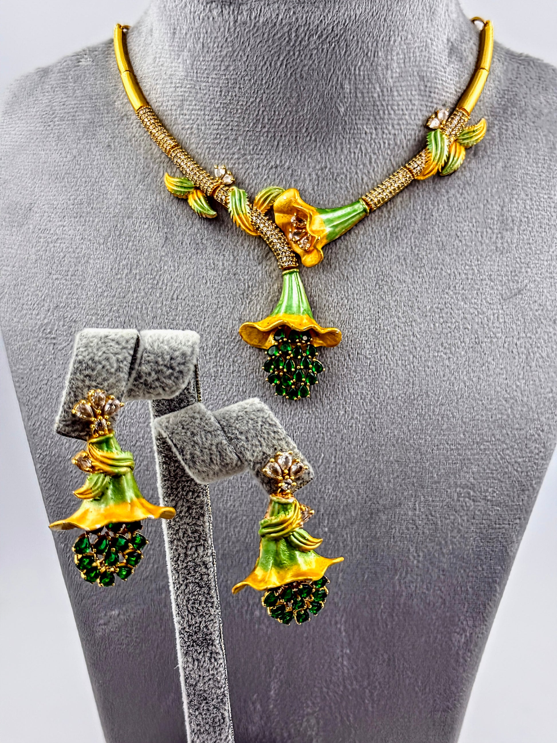 Introducing the exquisite Vionelie Garden Muse Set, a captivating cubic zirconia jewelry collection designed to bring a touch of nature's elegance to your style. This stunning set of jewellery with a Meenakari and emerald studding depicts a blooming flower. It's intricate, garden-inspired design, is for the woman who finds beauty in every detail and is ready to adorn the spotlight with her unique grace.