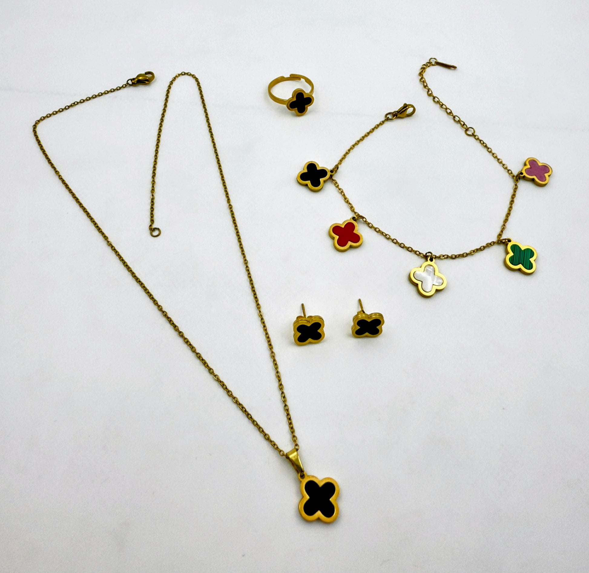 Introducing the exquisite Vionelie Lucky Parade Clover Set, a dazzling collection designed for the woman who embraces her moment in the spotlight. This high-quality, anti-tarnish jewelry set is a charming style collection, featuring a captivating clover motif, set against a radiant gold-toned finish.