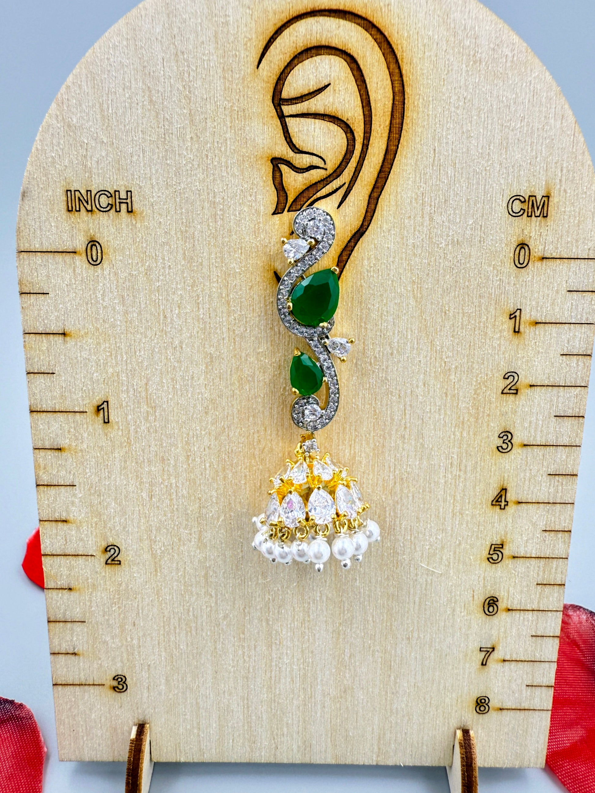 Introducing the exquisite Vionelie Panna Bela Jhumka, a beautifully delicate accessory designed to enhance your festive look with a touch of timeless charm. These elegant cubic zirconia jhumkas are more than just jewelry; they are a celebration of refined style and tradition, crafted to help you confidently adorn the spotlight at any celebration.