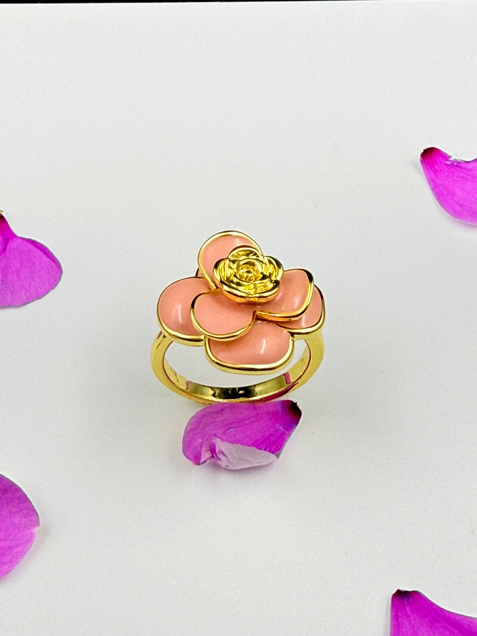 The ring features an ornate enamel flower design with multiple sculpted petals, giving it a beautiful three-dimensional effect. The eye catching pink colour of the petals is perfectly complemented by gold accents, creating a lovely contrast that evokes a sense of springtime elegance. Wear the Pink Daisy Ring to add a bold, cheerful touch of nature-inspired glamour to any look.