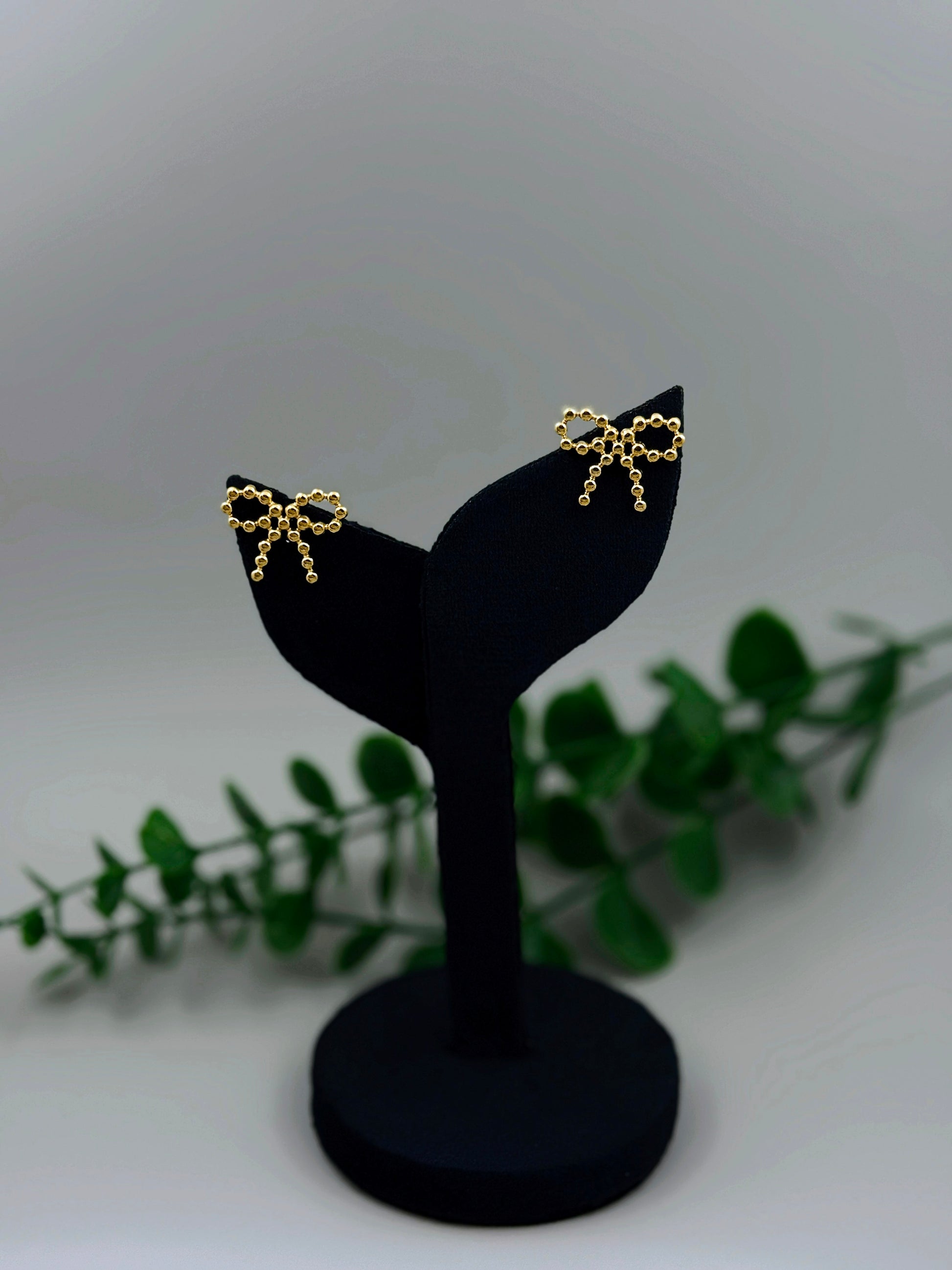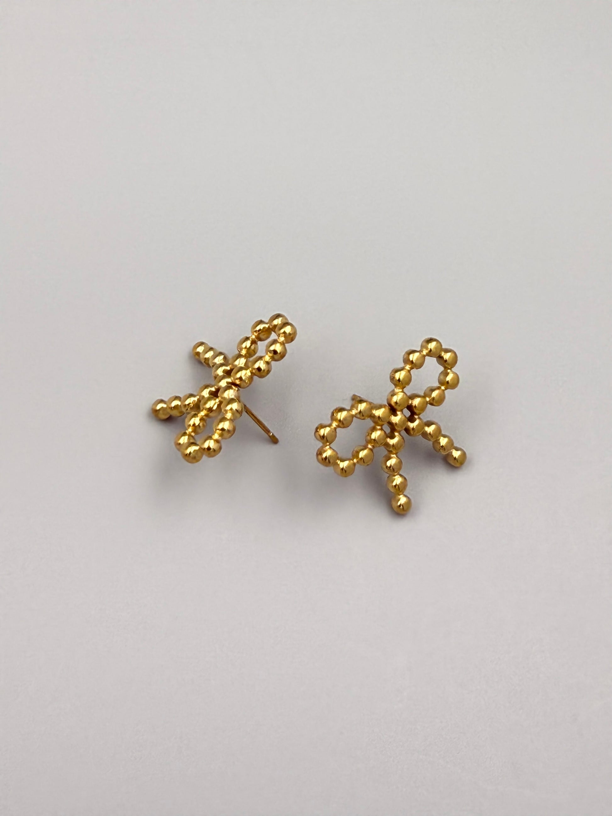 The studs are intricately made with multiple golden dots, which are arranged to perfectly form a miniature bow tie shape. This textural design offers a fresh, modern twist on a classic motif. The golden finish provides a soft, warm glow, giving the piece a delicate and utterly cute look.