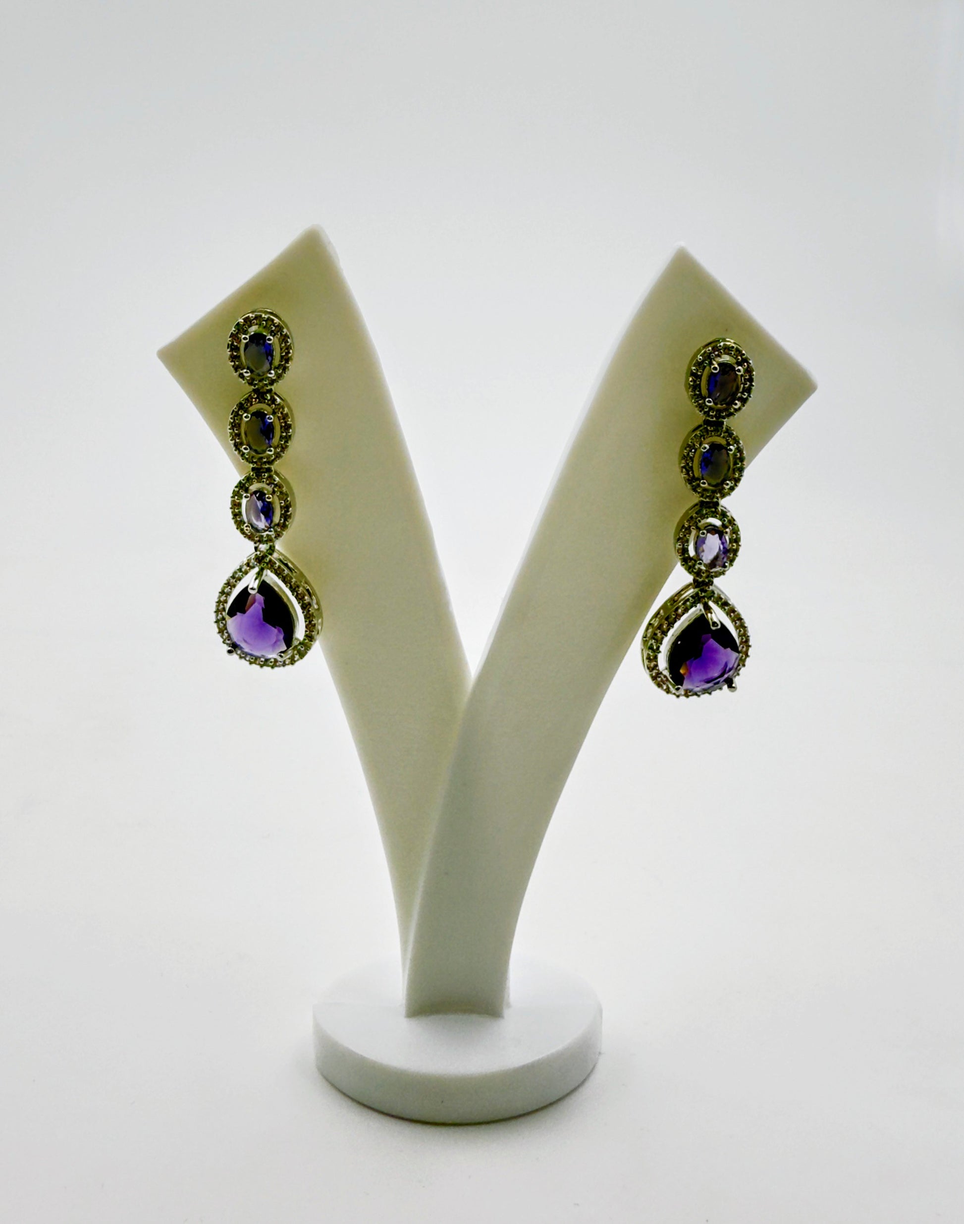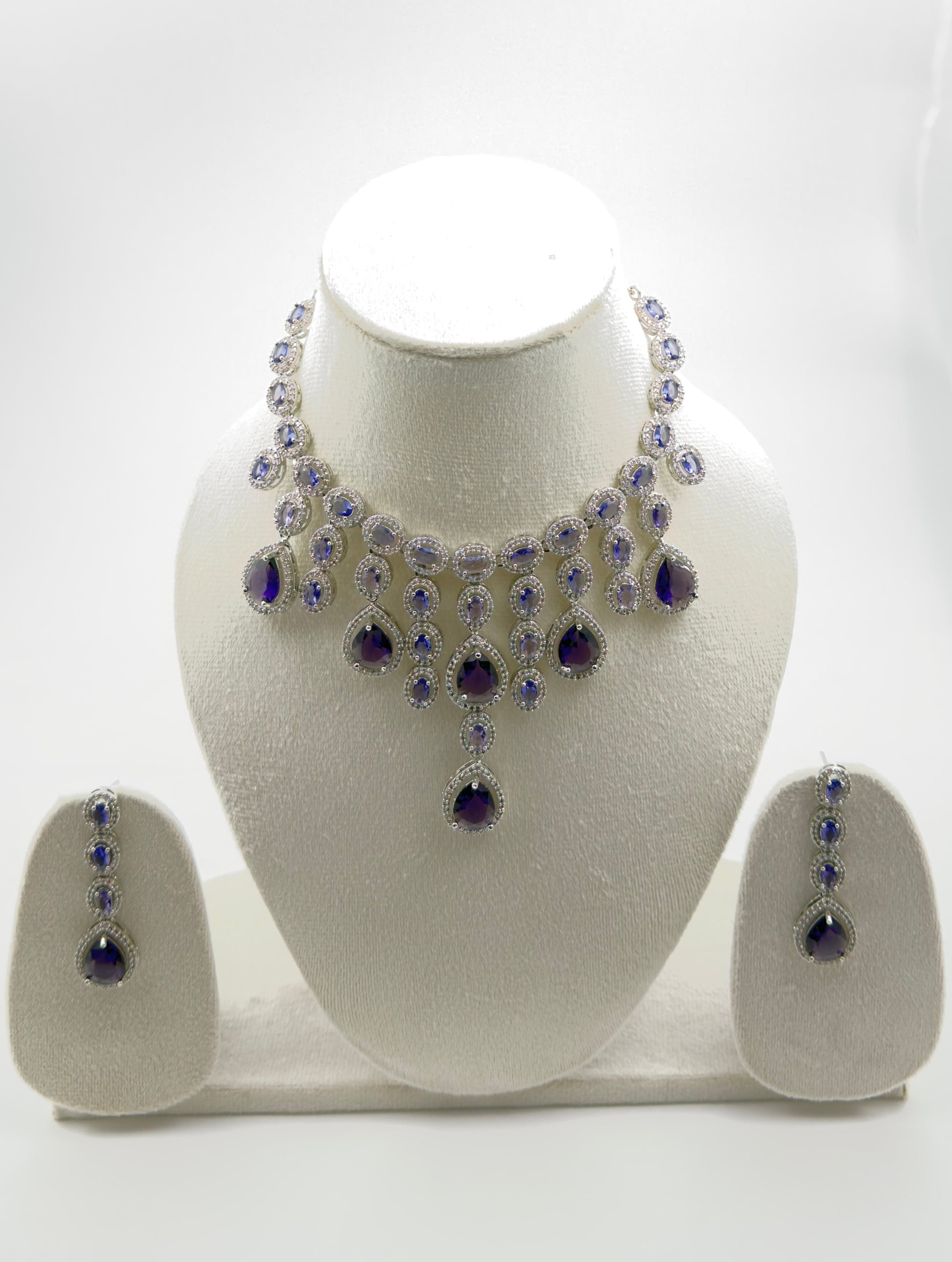 The centerpiece of this set is the evergreen design of a CZ necklace adorned with charms, including hanging diamonds, that gracefully drape to cover your entire neck. This intricate design, combined with the brilliant sparkle of high-quality cubic zirconia, creates a look of unparalleled luxury. The Purple Charm Set is a versatile and elegant choice, perfect for adding a touch of glamour to any outfit, from a formal event to a special evening out.