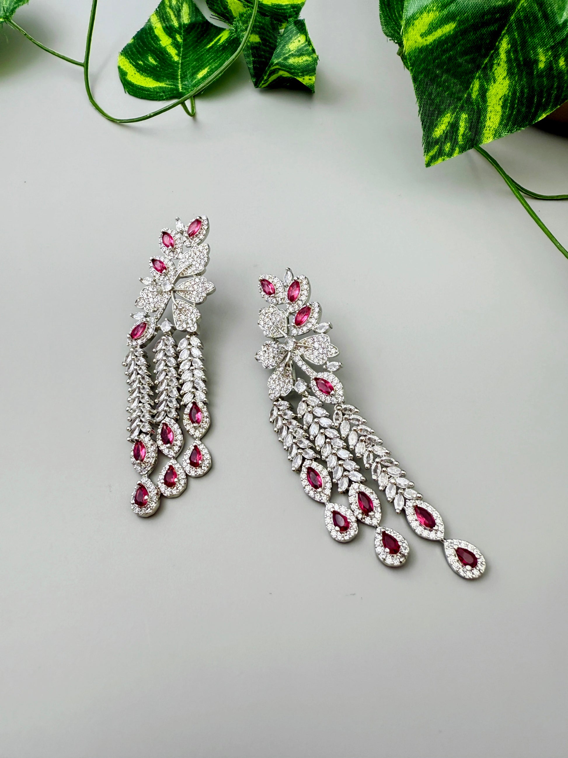 The dramatic silhouette of these statement earrings is complemented by the rich, ruby-colored cubic zirconia, which catches and reflects light with every movement. This beautiful "cascade" of sparkle creates a sense of fluid elegance and luxurious charm. The Ruby Cascade Earrings are the perfect choice for a grand event, a sophisticated party, or any occasion where you want to add a touch of fiery elegance and leave a lasting impression.